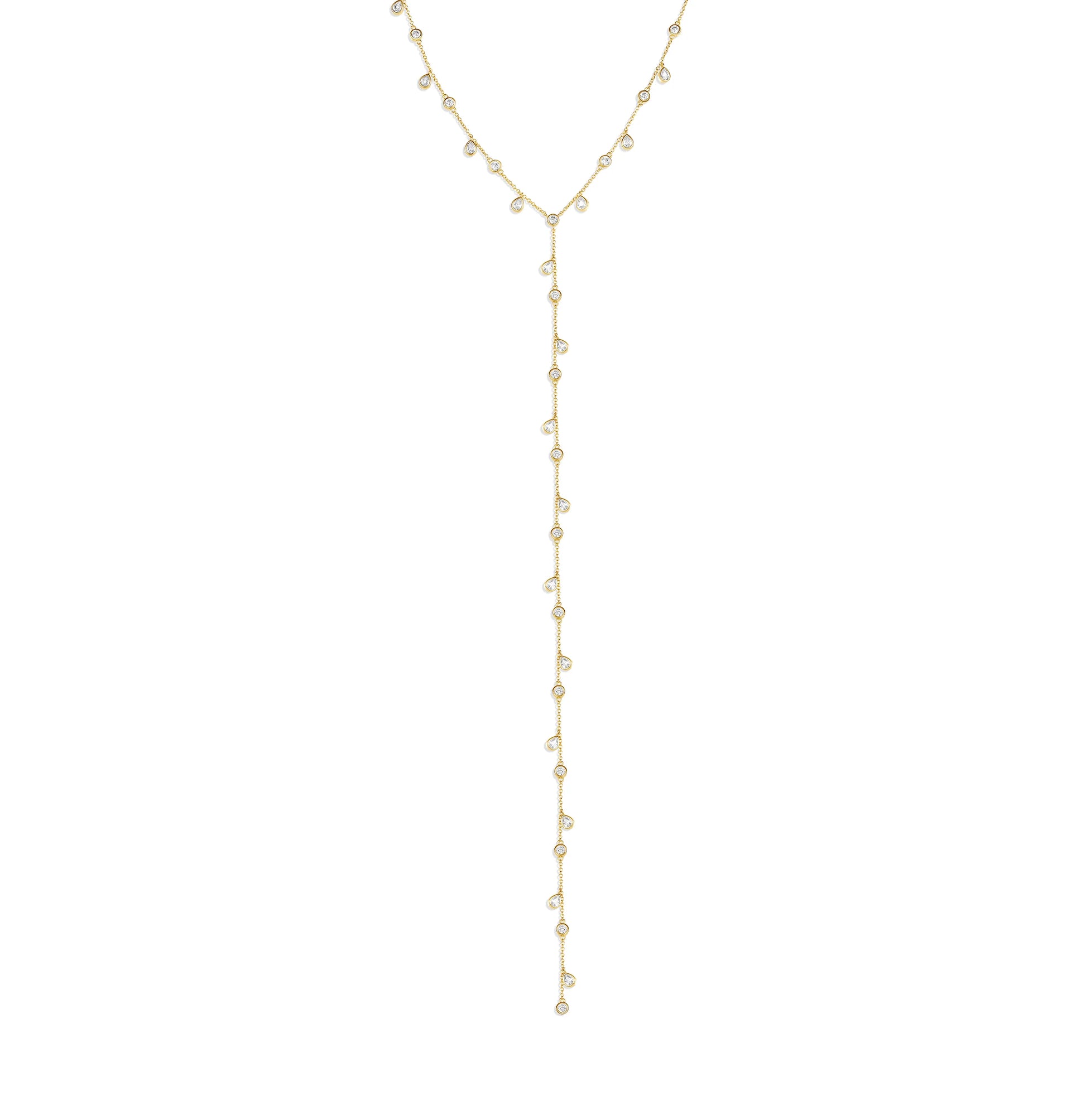 Un delicado collar con lazo en Y, diseñado para brillar con cada movimiento. Con circonitas cúbicas engastadas en bisel que caen con gracia por el escote, esta pieza crea una silueta alargada perfecta y un brillo suave y luminoso. Fácil de llevar solo e impresionante en capas, es un esencial atemporal que realza cualquier look al instante.