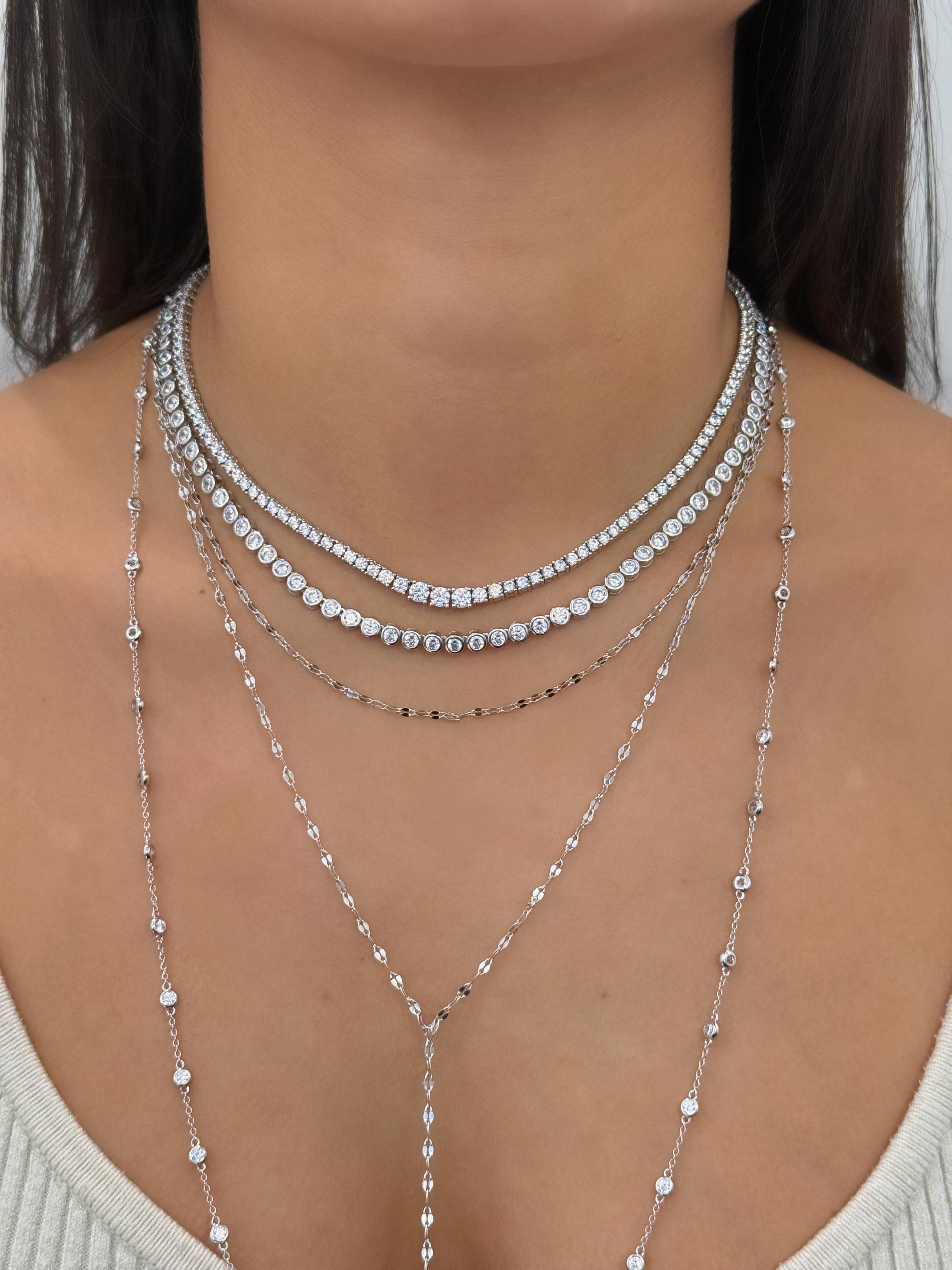 El collar de tenis de diamantes de 3 puntas es una pieza increíblemente única. Su diseño escalonado comienza con una piedra central más grande que se transforma a la perfección en diamantes más pequeños y brillantes, creando un estilo elegante y atemporal. Perfecto para usar en capas o solo, este collar agrega sofisticación a cualquier atuendo.
