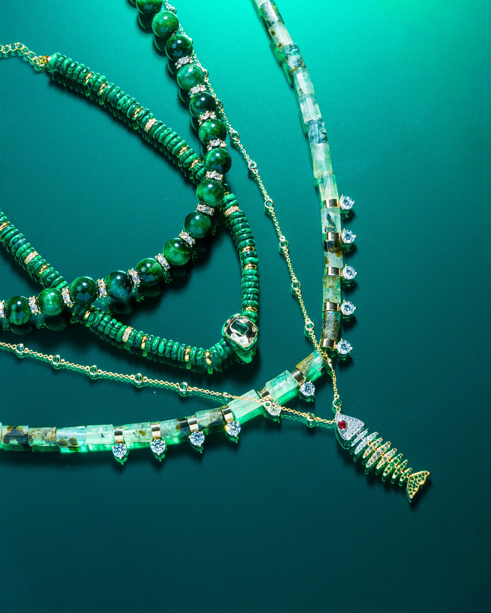 Las piedras ojo de tigre de color esmeralda evocan equilibrio y renovación, irradiando una elegancia moderna y un poder tranquilo.