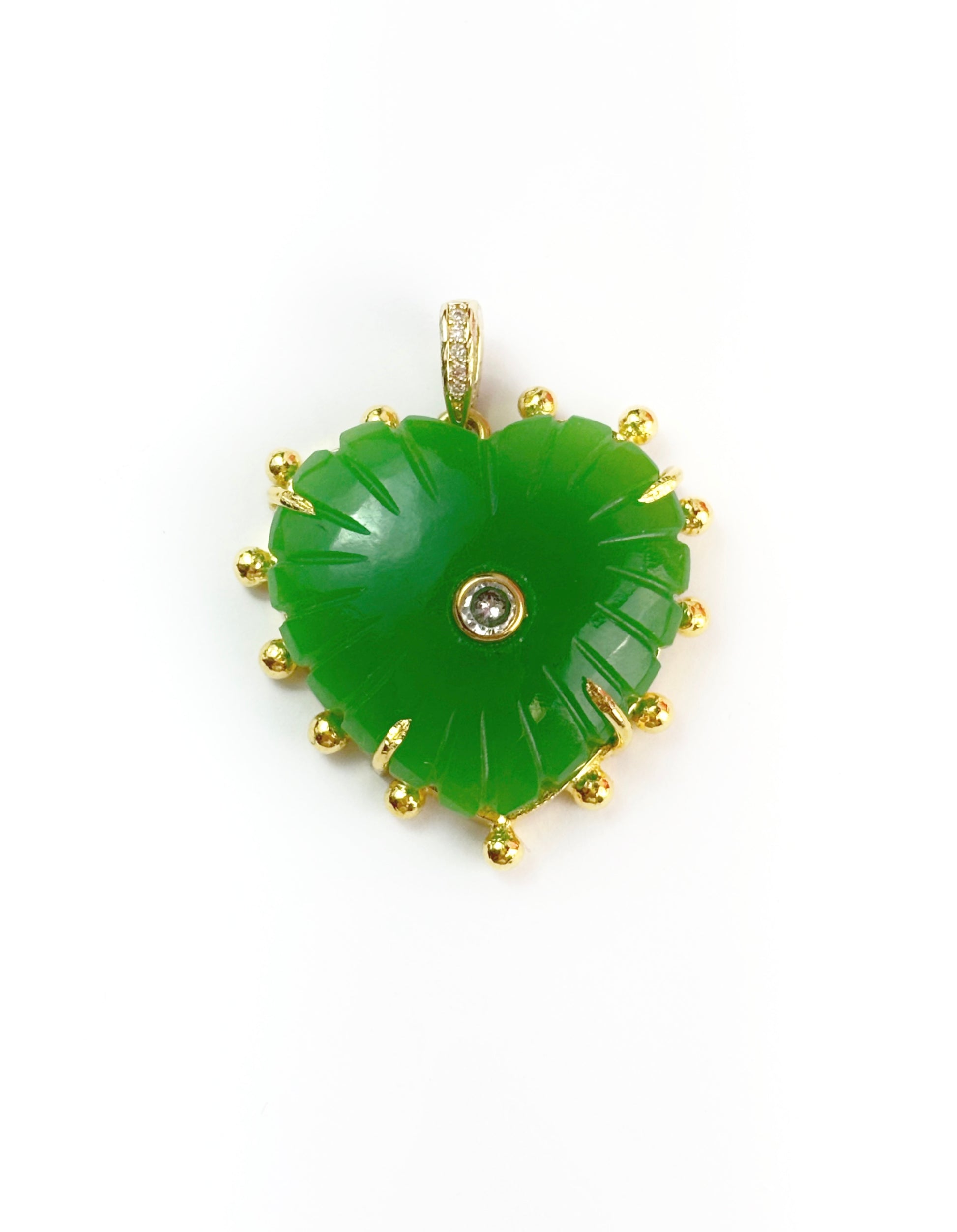 Este dije vintage de corazón de jade natural, con detalles tallados a mano, realza la belleza de cada piedra. Acentuado con una brillante circonita cúbica en el centro y rematado con un gancho chapado en oro de 18 quilates, es la pieza perfecta para realzar tu colección de dijes.