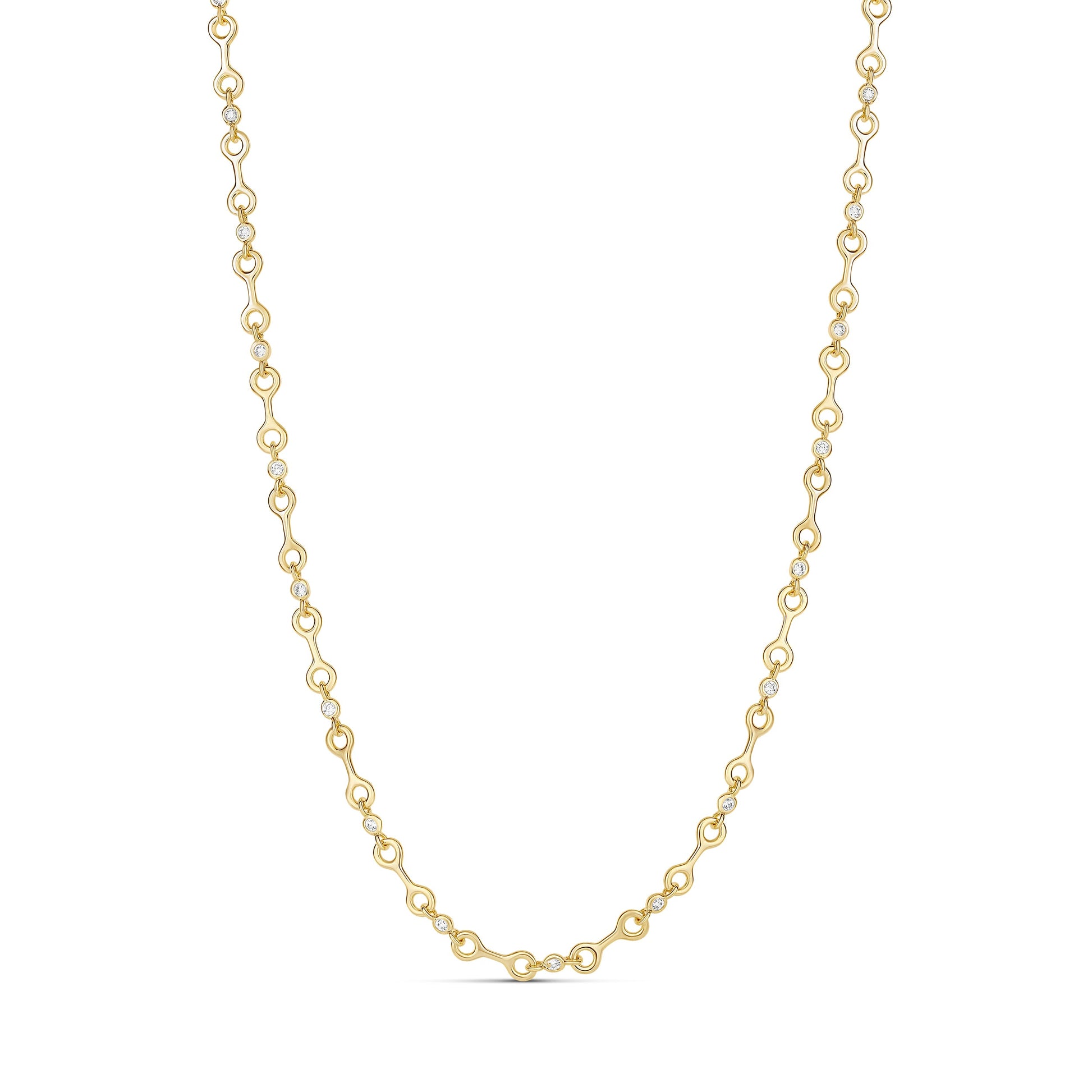 A sculptural gold link necklace inspired by softly contoured bone-shaped links, designed to bring subtle sparkle and modern elegance to everyday styling. Each link is accented with delicate bezel-set cubic zirconia stones, creating a refined balance between structure and shine.