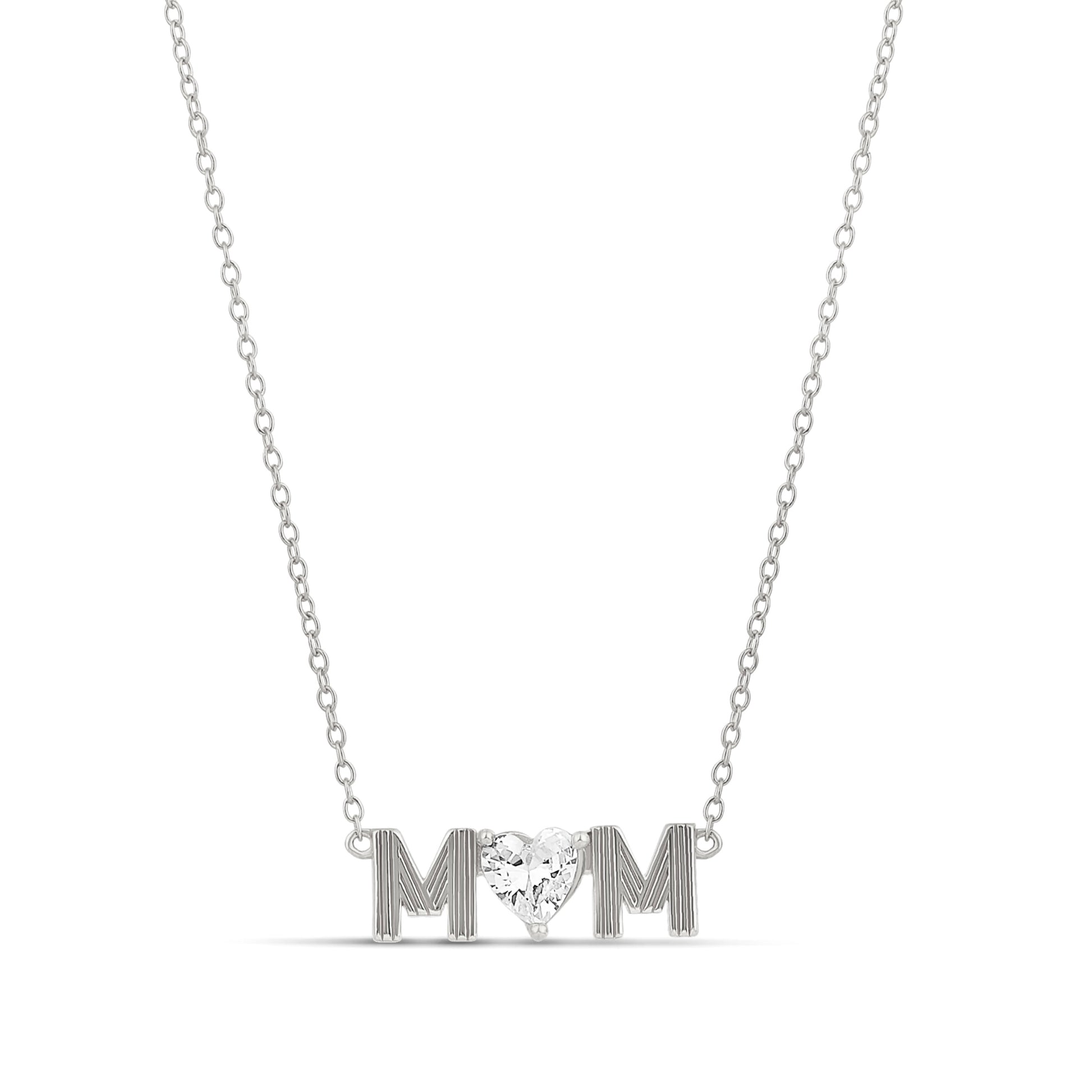 Celebrate love and motherhood with this beautifully crafted necklace. The word MOM is sculpted in a fluted design and accented with a heart-shaped cubic zirconia at the center—adding just the right touch of shimmer and sentiment. A delicate and meaningful piece she'll cherish every day.